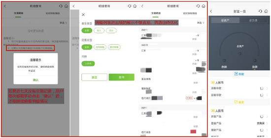 具体到“交易明细”,App支持查询近1年的交易记录,单次查询时间跨度不超过3个月(默认显示最近7天)。与去年评测时相比,明细列表展示有所提升,但单笔交易可读性仍有提升空间,筛选逻辑也可优化。值得注意的是,App默认展示最近7天的交易明细,如果没有符合条件的记录,用户需要手动 “确认”温馨提示后再选择筛选条件,查询效率仍待提升。