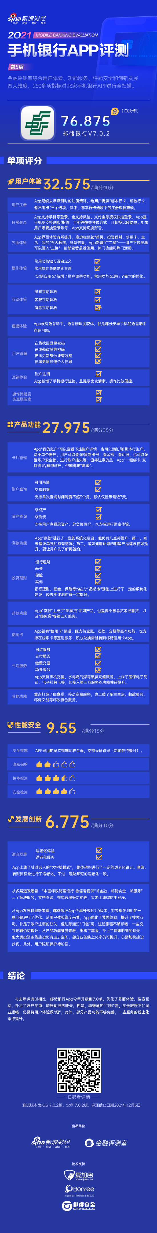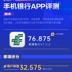 新浪金融评测室综合用户体验、产品功能、性能安全、创新发展4大维度,250余项细分指标对邮储银行手机银行App进行全扫描,最终给予76.875分(总分100)。