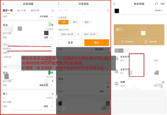 具体到“交易明细”,App支持查询近2年的交易记录,单次查询时间跨度不超过3个月。交易明细进出项比较清晰,但单笔交易可读性较差(部分交易记录不够清晰,且需下拉查看更多信息),也只能按收入/支出大类筛选,不支持搜索。