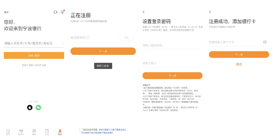 注册方面,持卡/非持卡用户在宁波银行App输入手机号码、验证码,设置登录密码后即可完成注册。注册成功后,用户可以选择绑定本行卡或他行卡,也可以选择“跳过”绑卡直接登录。