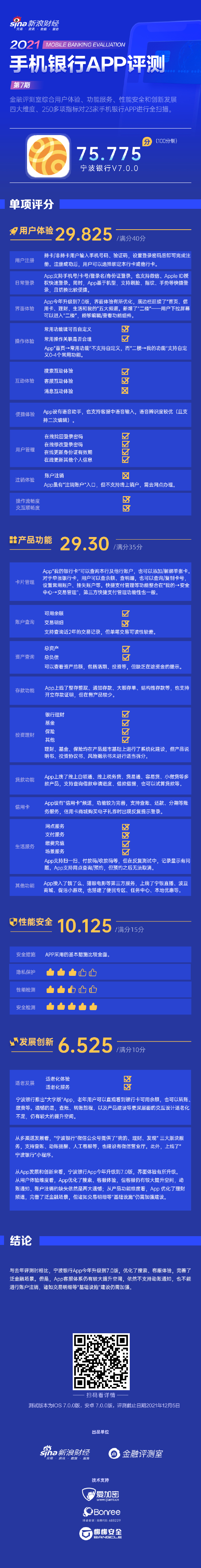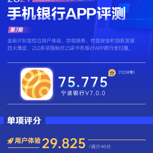 新浪金融评测室综合用户体验、产品功能、性能安全、创新发展4大维度,250余项细分指标对宁波银行手机银行App进行全扫描,最终给予75.775分(总分100)。