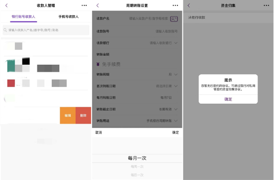 快捷转账方式上,App支持最近收款人快速转账(无法收录最近手机号转账记录)、复制卡号打开App诱发转账,也支持周期转账和资金归集。不过,周期转账不如同业预约转账更方便(单次转账预约设置比较繁琐),资金归集也不及同业他行卡转入方便。