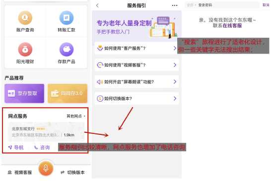 从适老化发展的角度看,光大银行持续优化针对老年人的“简爱版”,适老化改造逐步升级:可以快速找到账户查询、转账汇款等常用功能,且交易明细、转账旅程等均进行了适老化设计;上线了周周存3.0、整存整取等存款产品,增加了网点服务。特别是,服务指引、视频客服、语音助手、屏幕朗读等适老化服务不错,略遗憾的是搜索功能性待提升,文字客服字体依然比较小。