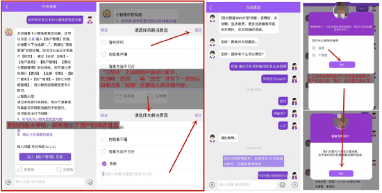 但是,客服体系仍有几点待提升:第一,无论用户从哪个功能触点求助客服,都要先浏览客服首页,虽然“客户服务→猜你想问”会根据进入点位进行相关匹配,但 “第一时间得到帮助”的感受不足;第二,对于大部分问题,智能客服匹配到了相关功能点,但回复有时太长且重复;第三,智能客服“无帮助”的交互太繁琐,用户需要“选择未解决原因→提交”才能看到“转人工”提示;第四,反复测试中,人工服务对话等待时间较长,服务结束后的评价旅程也可优化,并不需要用户反复“确定”。
