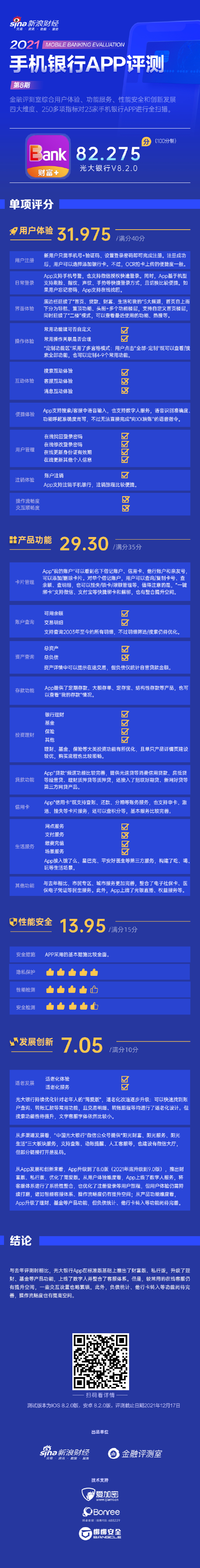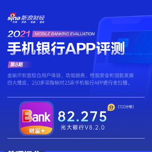 新浪金融评测室综合用户体验、产品功能、性能安全、创新发展4大维度,250余项细分指标对光大银行手机银行App进行全扫描,最终给予82.275分(总分100)。