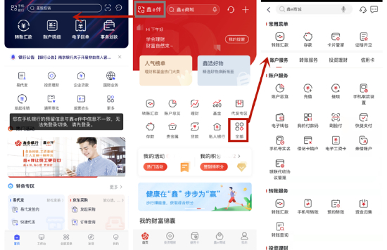 与去年评测时相比,南京银行App升级到了6.0版,重构了界面体验架构,底边栏调整为“首页、投资理财、信用卡、鑫e商城、我的”5大频道。具体来看,“首页”自上而下分为“导航、欢迎区、常用功能、活动/积分提醒、推广图和定制应用卡片”,用户可以定制0-5个应用卡片,也可以切换到“鑫e伴”企业银行。其中,“常用功能区”采用了“9+1”的十宫格模式,用户点击“全部”可以查看/搜索全部功能,不支持用户自定义常用功能。