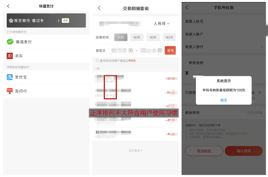 整体交互方面,南京银行App可以快速找到查账、转账等常用操作,且常用操作之间进行了适当交互。不过,App仍有一些问题亟待解决:第一,同一网络同一机型条件下,南京银行App操作流畅度仍待提升;第二,冗余交互仍可优化,比如用户换手机登录时,输入登录密码后再度提示“登录验证”,然后输入动态密码,提示“设备绑定成功”,而同业的一般的处理方式是直接提示输入验证码进行验证;第三,部分安卓机型出现兼容性问题。