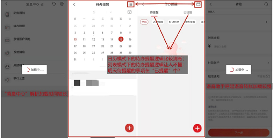 消息互动方面,南京银行App“消息中心”整合了动账通知、待办提醒、银行公告等,用户可以开启/关闭待办提醒、动账通知,也可以一键已读所有消息。对于“动账通知”,在测试中App无法进行弹窗推送,不过列表中单笔通知可读性较优;对于“待办提醒”,App支持用户手动添加/删除提醒,但“列表模式”下的“待提醒/已提醒”逻辑不顺畅。此外,“消息中心”解析加载时间较长。