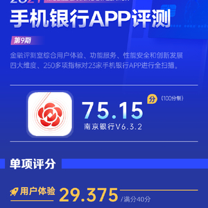 金融评测室综合用户体验、产品功能、性能安全、创新发展4大维度,250余项细分指标对南京银行手机银行APP“南京银行”进行全扫描,最终给予75.15分(总分100)。