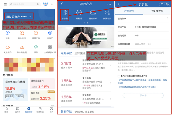 投资理财方面,中国建设银行App设有“投资理财”频道,顶部显示“理财总资产”,下方沿用“7+1”的八宫格模式,用户点击“全部”可以查看全部投资产品:囊括了基金投资、理财产品、黄金积存、账户贵金属、保险、存款、证券服务、债券投资、期货资管产品等各大类投资产品。但是,“理财总资产”建设仍待提升,特别是存款的计入有滞后。