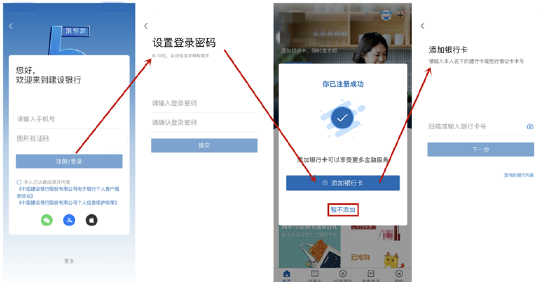 注册方面,中国建设银行App优化了注册流程,新用户只需输入手机号、短信验证码、设置登录密码即可完成注册。注册成功后,用户可以选择添加银行卡,添卡旅程也比较清晰,且支持OCR识别卡号、身份证信息等。