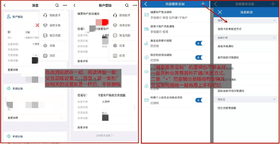 消息提醒方面,中国建设银行App“消息”整合了账户变动、待办提醒、系统公告、服务通知、发现生活、金融资讯等内容,可以分类置顶/清空消息。用户每一笔交易,App会进行弹窗提示,且每笔通知可读性较优。不过,“消息”仍有一定的提升空间:第一,“消息”首页阅读体验待提升,默认展示账户变动、系统公告等各类消息,且每类消息样式不一,糅在一起稍显混乱;第二,整体设置逻辑待提升,消息首页和各类消息的“…”层级一样,消息服务定制的逻辑也有些混乱;第三,智能日历/待办提醒的逻辑一般。