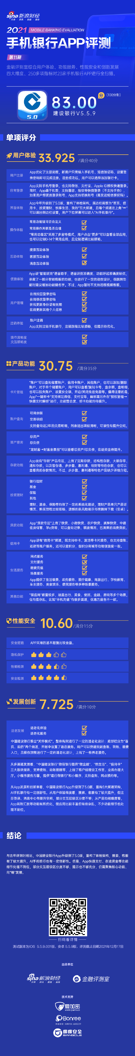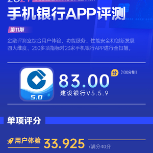 新浪金融评测室综合用户体验、产品功能、性能安全、创新发展4大维度,250余项细分指标对中国建设银行手机银行App进行全扫描,最终给予83.00分(总分100)。