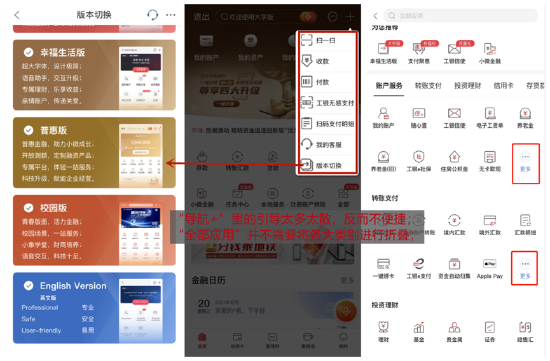 值得注意的是,标准版App在改版过程中,试图尽量不影响老用户的使用习惯,采取了很多折中措施,比如保留“我的账户”两版切换、“交易明细”和“随心查”切换等等,但实际效果一言难尽。以“我的账户”为例,新版界面更美观但查询效率有所降低,而老版界面的交互体验又不够优,反而不如“幸福生活版”处理得更好——一定程度陷入“新用户不理解,老用户不习惯”的难题中。