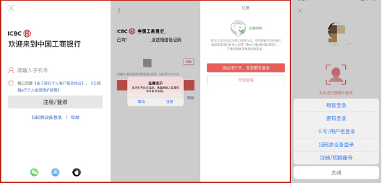 中国工商银行App注册旅程比较顺畅,新用户输入手机号及短信验证码、设置登录密码即可完成注册。注册成功后,用户可以选择添加本行/他行卡,且添卡流程比较便捷。