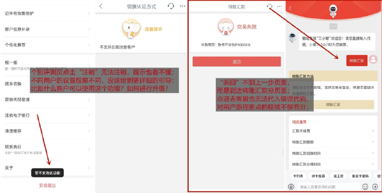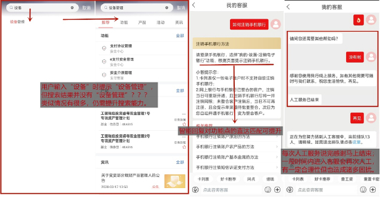 整体交互方面,中国工商银行App可以快速找到账户查询、转账汇款等常用操作,且常用操作之间进行了交互。若用户旅程受阻,App会提示受阻原因并给出了错误代码,但下一步的接续待提升,诸如用户转账时输错银行卡号,提示账号不存在,但“返回”不返回上一步转账页面,求助客服也不能代入错误代码。而且,不同类型客户各种设置权限不一样,但App没有给出原因或引导,让用户无从下手。