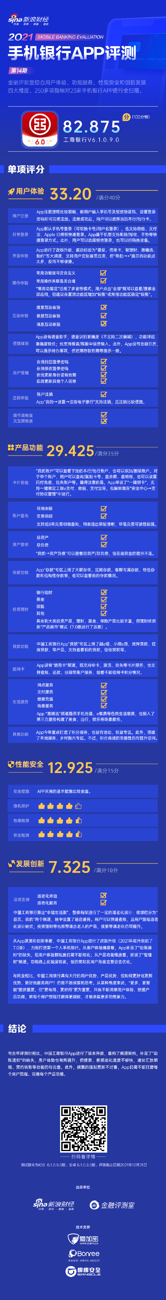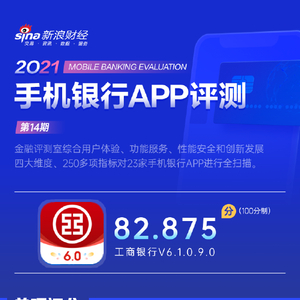新浪金融评测室综合用户体验、产品功能、性能安全、创新发展4大维度,250余项细分指标对中国工商银行手机银行App“中国工商银行”进行全扫描,最终给予82.875分(总分100)。
