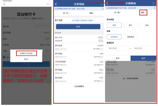 账户管理方面,上海银行App“我的账户”可以查看已绑卡片情况,也可以添加/解绑本行卡。对于单张银行卡,用户可以查询/复制卡号、查余额、查明细,也可以进行相关卡片管理——包括锁卡、挂失、开启/关闭小额免密免签等。值得注意的是,App单设了“一键绑卡”但功能性一般,个别测试员在借记卡状态正常时绑定快捷支付,却被提醒 “此银行卡已冻结”。
