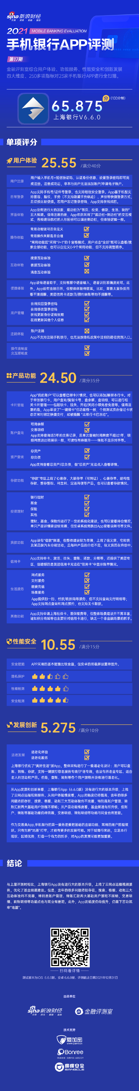 金融评测室综合用户体验、产品功能、性能安全、创新发展4大维度,250余项细分指标对上海银行手机银行App“上海银行”进行全扫描,最终给予65.875分(总分100)。