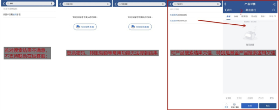 除了两大基础用户旅程不顺畅之外,App其他交互设置也存在各种问题:一是,诸如“客户信息维护”等部分功能名称、部门提示不够人性化;二是,各种冗余交互比较多,比如添卡/删卡后提示用户进行确认,但用户除了“确认”也没有别的选择;三是,在同一网络条件下同样机型的反复测试中,App整体流畅度尚待提高,不少操作等待时间较长,平均报错率也高于同业,且个别安卓机型出现不兼容问题。