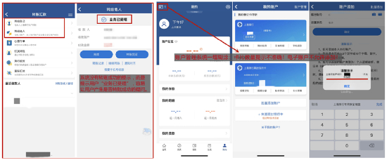 整体交互方面,上海银行App用户可以快速找到账户、转账汇款、扫一扫等常用操作,且常用操作之间进行了一定的交互。但是,转账汇款的交互设置落后同业:App从银行业务视角,将转账汇款分为“转给自己”(本人本行账户)和“转给他人”(本人、他人的他行账户);但从用户视角来看,“自己”和“他人”的区分在于“人”,而不在于是不是本行账户,因此业内大部分银行早已摒弃了此种设置。此外,转账结束后的提示也有完善空间。