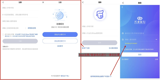兴业银行信用卡App“兴业生活”注册比较便捷,持卡/非持卡用户输入手机号、设置登录密码、接收短信验证码,即可完成注册。注册成功后,用户可以添加兴业银行卡或其他银行卡,也可以先报名占坑。不过,App注册/登录尚未进行一体化处理。