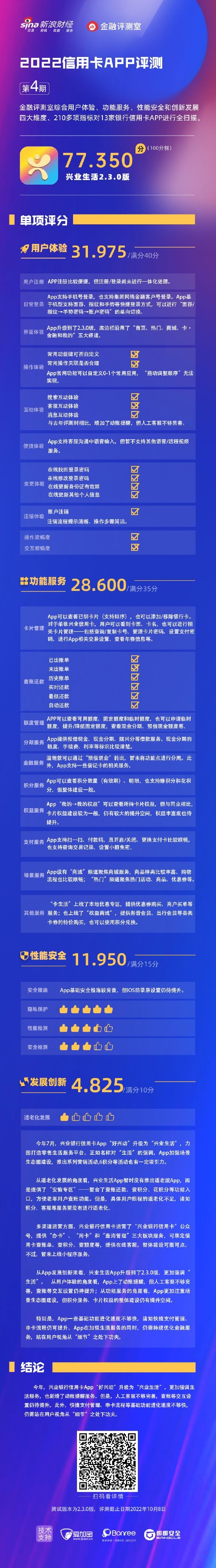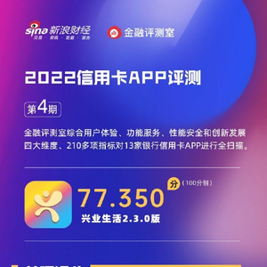 金融评测室综合用户体验、功能服务、性能安全、创新发展4大维度,210多项细分指标对兴业银行信用卡App“兴业生活”进行全扫描,最终给予77.350分(总分100)。