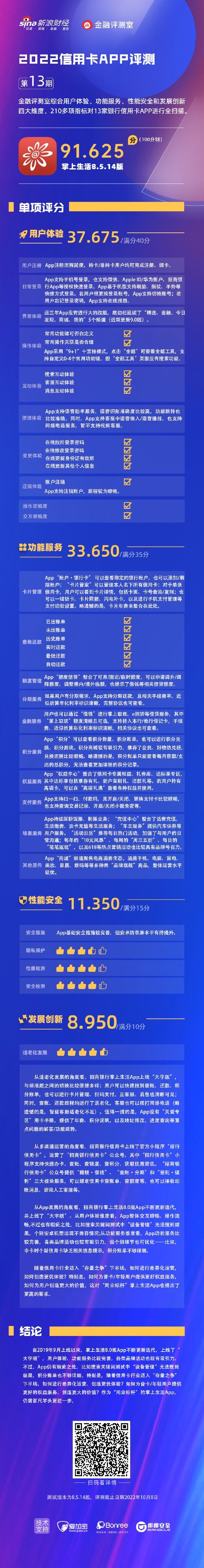 金融评测室综合用户体验、功能服务、性能安全、发展创新4大维度,210多项细分指标对招商银行信用卡App“掌上生活”进行全扫描,最终给予91.625分(总分100)。