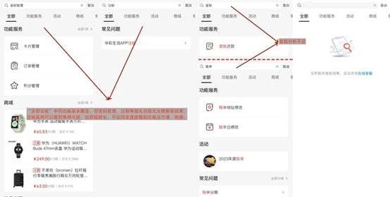 搜索互动方面,华彩生活App“首页、生活、金融”频道设有搜索入口,可以查看搜索历史(“常用功能”稍显突兀),支持对功能服务、活动、商城和常见问题的搜索。与2022年评测时相比,搜索体验有一定进步,但仍存在以下问题:第一,对活动的覆盖度尚可,但对功能的覆盖度有待提升,诸如“密码管理”、“注销”等已有的细分功能无法搜出结果;第二,智能分析水平不足,比如“查账”可以搜出“查账还款”但“账单”搜不出;第三,用户搜索不到结果时可以联动客服,但无法代入搜索关键词。