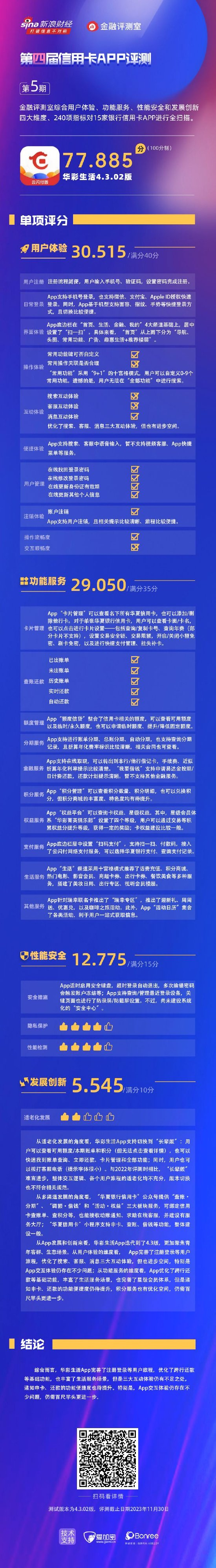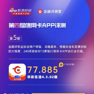 金融评测室综合用户体验、功能服务、性能安全、发展创新4大维度,240项细分指标对华夏银行信用卡App“华彩生活”进行全扫描,最终给予77.885分(总分100)。