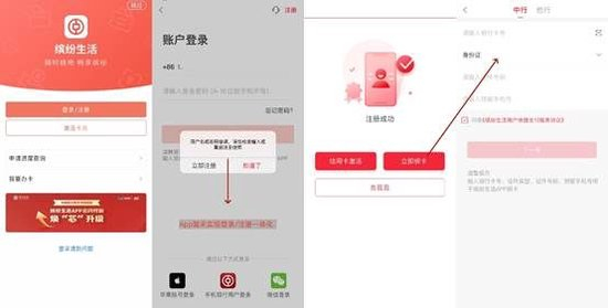 中国银行缤纷生活App新用户输入手机号、短信验证码,设置登录密码即可完成注册。用户注册成功后,可以选择“立即绑卡”,支持绑定本行/他行银行卡。遗憾的是,App暂未实现登录/注册一体化。