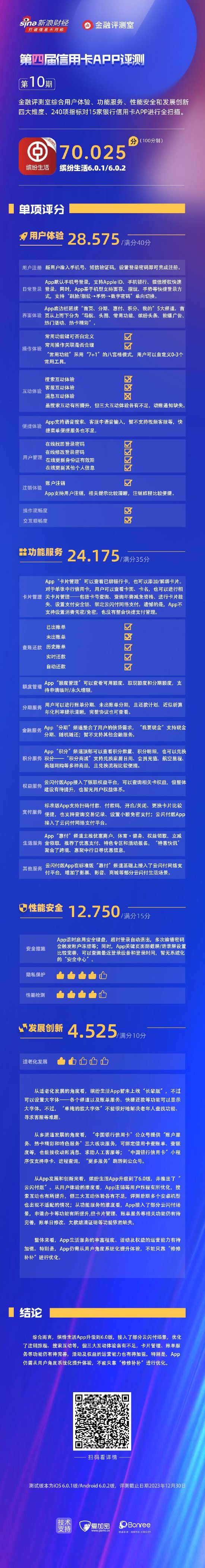 金融评测室综合用户体验、功能服务、性能安全、发展创新4大维度、240项细分指标对中国银行信用卡App“缤纷生活”进行全扫描,最终给予70.025分(总分100)。