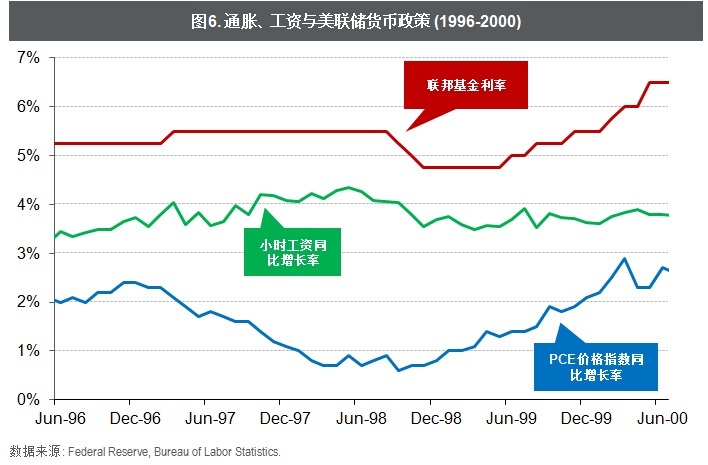 在此期间,美国工资增长的趋势被目标通胀率持续的下降所抵消,迫使美联储停止了加息的步伐,并在长期资本管理公司危机之后放松了货币政策以救市(图6)。美股在经历了1998年夏天近20%的回调后再创新高。