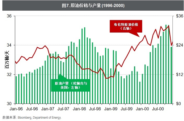 笔者对市场更大的担忧来自于油价企稳反弹的阶段。当油价反弹时,上述的投资策略几乎将全部逆转。当前的宏观环境同1997-1999年极其相似,限于篇幅,笔者本文中只回顾一下油价的走势对美联储政策的影响。从1997-1998年,欧佩克供应量的持续增长与亚洲经济体需求疲软使得原油价格下跌过半。