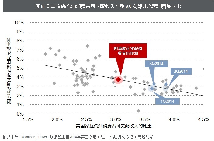 油价的下跌在总体上提振了世界经济。在油价继续下跌的过程中,原油进口国的消费者和制造业将得益于其中。由于原油需求短期内的弹性较低,低油价的效果等同于一次减税,带来更多的消费并改善非能源产商的利润空间。以美国为例,汽油消费占可支配收入的比重同非必需消费品的开支(discretionary spending)有显著的相关性(图5)。在就业与工资持续增长的环境下,低油价将导致更多的消费支出,从而提振消费类的股票。