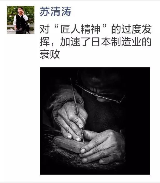 在过去的几个月里,“匠人精神”是一个很火的词。官员、学者及媒体频繁提及这个词,与“供给侧的结构性改革”有关。似乎,大家一致认为,中国制造业要向高端转型,就必须依靠“匠人精神”。不过,日本制造业的的衰败则带给我们一个教训——对“匠人精神”的发挥,也要适可而止。