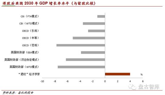 自2015年3月以来,IMF、OECD、英国央行、英国财政部等主流机构相继发布研究报告,一致支持英国留欧。这些报告认为,退欧将在经济增长、不确定性、贸易环境、外资流动等诸多方面产生负面影响,使英国和全球蒙受高额经济损失。当然,权威言论并非没有遭遇挑战,其他一些机构的观点就与之针锋相对。穆迪等中立机构提出,虽然英国退欧必然带来经济成本,但该成本并非不可承受;另一些支持退欧的经济学家认为,退欧的经济利益会超过经济成本,从而将带动英国社会福利的提升。