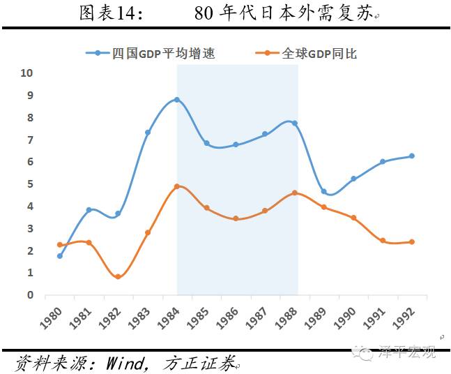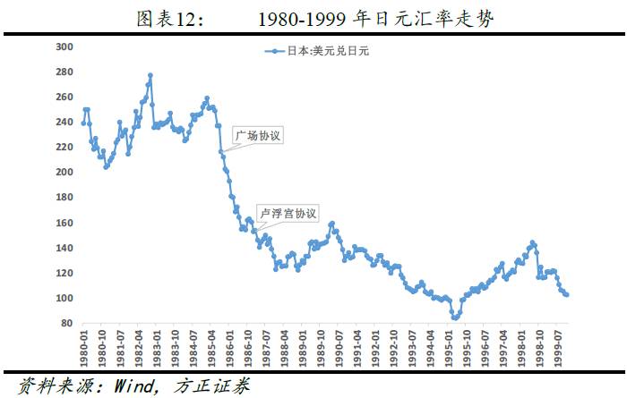 日元升值对日本贸易的负面影响持续时间较短。理论上讲,日元升值不利于出口,有利于进口。1985年9月“广场协议”签订后,日本出口出现了短时的停滞,1986年和1987年出口同比分别下滑了15.89%和5.60%。但是,外需环境也是影响出口的重要因素。80年代世界经济步入弱复苏小周期,1988、1989和1990年日本出口增速逐渐转正,分别录得1.87%、11.44%和9.61%。也就是说,日元升值对日本出口的负面影响只是在日元急速升值的阶段。