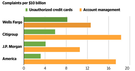 富国银行因销售误导而开设虚假账户的行为也不仅仅是孤案。美国消费者金融保护局(Consumer Financial Protection Bureau,CFPB) 投诉数据库显示,在交叉销售和其它违规销售方面,富国银行遭到投诉的数量并未显着超过同行。例如,S&P Global Market Intelligence分析显示,2015年1月1日至2016年9月20日期间,共有1576宗针对富国银行账户管理行为的投诉,包括该行开立和注销账户的方式;花旗集团(Citigroup Inc.,)为1722起账户管理问题。从投诉量占每10亿美元存款比例看,富国银行、花旗集团、美国银行(Bank of America Co.)和摩根大通(J.P. Morgan Chase & Co.)分别为1.3、1.8、1.7和1.1宗(见图2)。