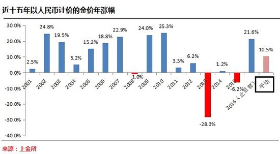 近期金价的大跌冲击了投资者的信心,实际上跟风险资产的波动相比,黄金价格的波动普通投资者完全可以承受,金价日涨跌超过5%的行情不足1%。近十多年来,黄金以其优异的表现,给长线投资者递交了一份近乎完美的答案。在过去十五年中,以人民币计价的黄金价格年平均以10%的速度上涨。其中除了2008年、2013年和2015年,黄金价格的上涨几乎没有受到太大的阻力。