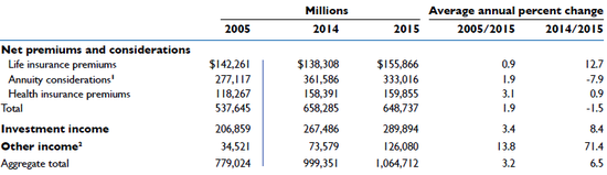 这种稳健的资产配置结构也决定在收益结构上不是严重依赖于投资收益,而是通过对产品、渠道和成本管理等实现价值增长。这种价值增长也是与偿付能力管理和资产负债管理一体的。例如,美国寿险业净保费及对价(net premiums & considerations)一直是是超过投资收益的(见图3)