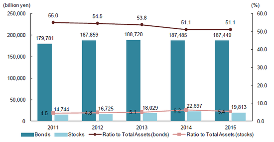英国保险集团资产配置中权益投资的比例普遍高于美国、日本和欧洲大陆法系国家。例如,2015年美国寿险业资产配置中普通股股票平均比例为30.7%,其中独立账户为78.3%。虽然2015年英国本土权益证券配置比例较2005年下降16个百分点,但海外权益证券和信托(Unit Trust)比例却分别上升6和11个百分点。2015年度,日本保险业虽然证券资产占总资产比例为81.8%,但债券占证券资产的86.38%(其中政府债券占53.9%),股票占比仅为8.76%。在债券资产的配置结构上,美国和日本是截然相反的(参见《从美国寿险业资产配置审视国内险资举牌行为——保险公司举牌上市公司行为分析之二》)(见图1、2和表2)。