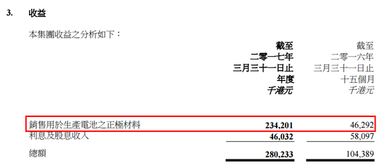 如下图所示,公司已经在截止至2017年3月31日的2017年报中,电池的正极材料销售额为2.34亿港元,同比增长409%。并且,正极材料也已经成为公司的主要业务及营收来源。