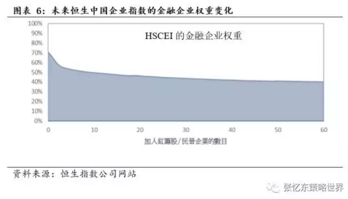 根据恒生指数公司预期,随着红筹和民营企业的加入,未来金融占HSCEI的权重将降至50%以下。