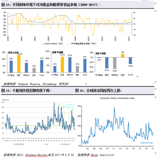 但无论如何,整个行业仍将面临一些结构性逆风因素和其他冲击。一是政治风险可能仍然高发频发。尤其是未来一两年,朝核问题和美国贸易保护主义仍无平息迹象,这些因素可能造成资产和股市的高相关性(图15)。二是技术带来的结构性负面影响具有长期性和持续性。近年来量化技术尤其人工智能投资的发展使得类似对冲基金积极管理人的超额收益可以被系统性获取,而投资者仅需承担低廉的费用。这种革命性的进步从根本上质疑了对冲基金投资收益的来源和费率体系,长远来看将会对对冲基金行业产生重大影响。