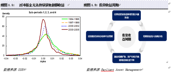 学术研究表明单个对冲基金的超额收益很难持续。据Ken Zhong的分析,对冲基金的超额收益分布随时间发生较大变化,呈现出左尾维持和右尾收缩的现象。分布的左尾扩张即表示超额收益为负的基金增多,劣质管理人增加;右尾收缩表示获得正超额收益的基金无法持续获取超额回报。Ken Zhong的分析揭示出单个对冲基金超额收益难以为继。