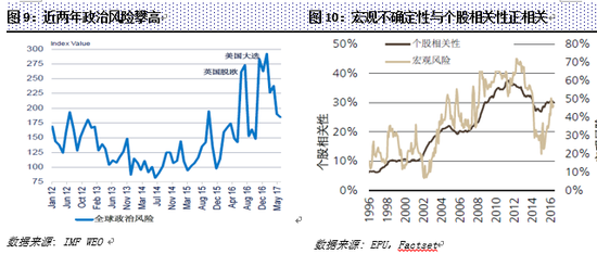 在政治层面,金融危机以来全球政治风险提升,风险高度共振。尤其是2016年至17年,英国脱欧、川普当选等黑天鹅事件频发,导致全球政治风险上升,特朗普新政等宏观因素影响显著(图9)。高度的政治和宏观风险促使市场出现同涨同跌(Risk on Risk Off)现象,股票价格的驱动因素日趋一致,个股相关性上涨,使得对冲基金难以获得超额收益(图10)。同时,政治风险的不确定和难预测性也使得对冲基金经理人无法通过合理预测并承担更高风险来获取风险补偿。