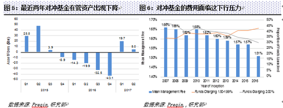 更重要的是,技术发展给对冲基金行业带来根本性冲击。当前,Smart Beta等策略的发展已经可以系统性、低费率地获取超额收益;一些量化交易的复制策略系统分析对冲基金的超额收益来源,并通过公开市场交易工具进行快速复制,给部分对冲基金管理人带来了较大负面影响。90年代金融危机下大部分对冲基金的消亡已使人们意识到大部分对冲基金并不能抵御系统风险,此后的技术发展、信息透明化和量化分析技术广泛应用也帮助人们对超额收益的来源有了更加清晰的认知。大量研究表明剔除风险因子后的超额收益实际上并不显著,真正主动管理能力带来的超额收益非常困难。