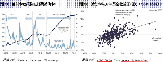 在货币政策层面,自金融危机后,全球各央行纷纷实行低利率政策刺激经济,带动全球复苏。全球央行实施的低利率和量化宽松等非常规货币政策在助推同涨同跌现象的同时,也压制了市场波动性。股票波动率大幅下降,债券收益在历史低点震荡,信用利差明显收窄,市场定价错位机会减少,压低了对冲基金的投资收益(图11)。而鉴于对冲基金投资收益与股票波动率的长期关系,波动率越低,对冲基金越不容易超越股票收益(图12)。同时,高流动性市场提高了股票间的相关关系,个股间差别下降,也压低了股票多空策略的投资收益。