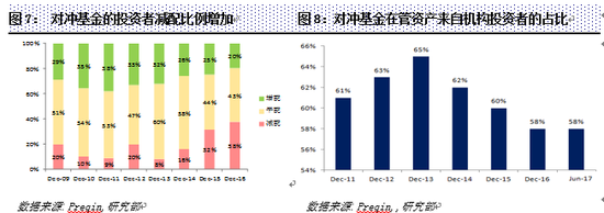 正是一些机构投资者采取了调整,机构投资者占对冲基金总资产的资金占比不断下滑。2013年前曾不断上升,份额占比达到65%,至2016年已经下滑至58%(图8)。